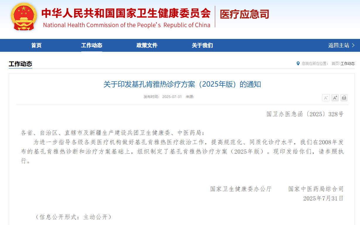 国家卫健委印发《基孔肯雅热诊疗方案(2025年版)》